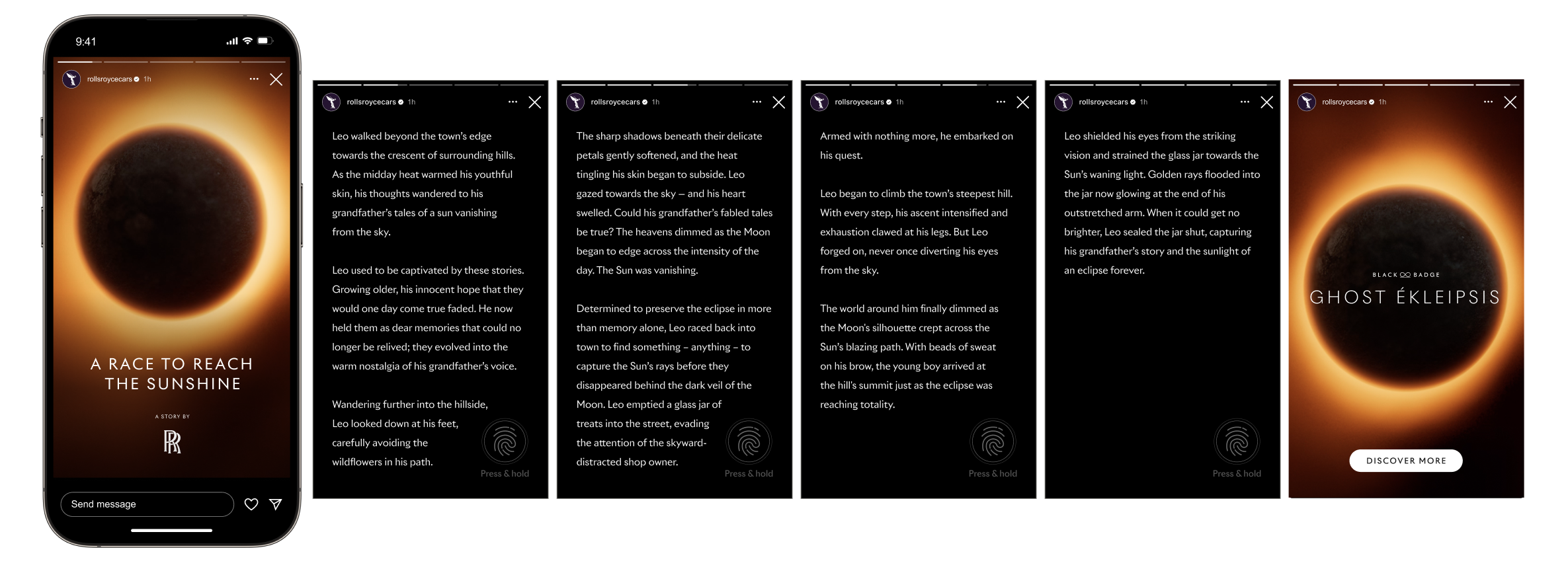On social media, I explored a fresh storytelling approach to elevate our campaign. Drawing inspiration from the awe-inspiring spectacle of a social eclipse, our writing team crafted a fictional story for IG Stories, inviting users to pause and immerse themselves in a tale of wonder.